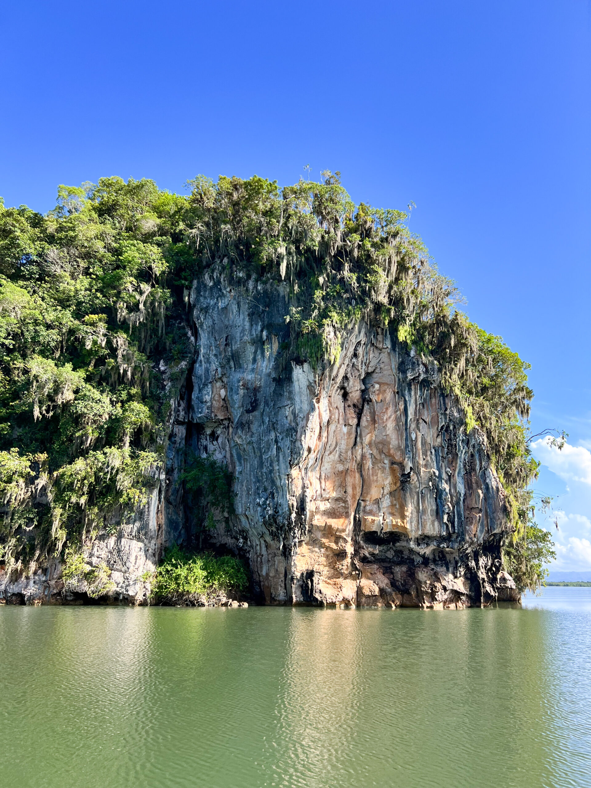 El espectáculo es impresionante: enormes acantilados kársticos se elevan sobre el mar, creando un paisaje que recuerda a la bahía de Ha Long en Vietnam, pero con el encanto caribeño de Los Haitises.
